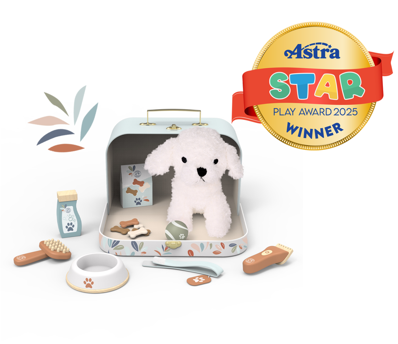 Children will have everything they need in this beautifully designed suitcase to take care of their favorite dog plush (included). Features dog snacks, bowl, brush, collar and a few more accessories. Plan your trip and take along all that is needed for you and your dog to live fun adventures! This toy is crafted from sustainably sourced wood from FSC® certified forests and coated with non toxic paint.