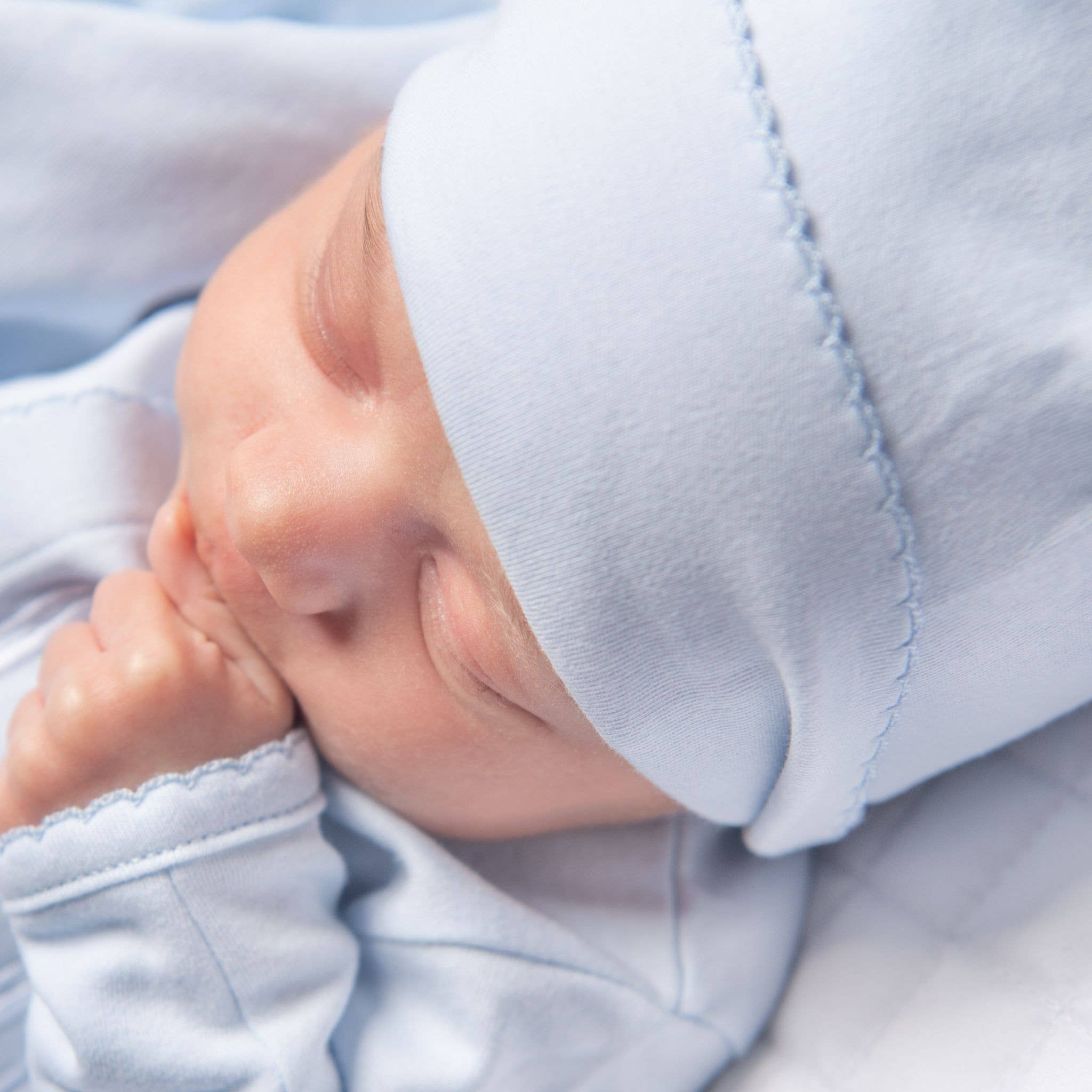 Magnolia Baby's Essentials Solid Blue Hat is a must-have for your baby's layette. The buttery soft, light blue Pima cotton with picot trim makes this sweet hat a classic staple. You can use it as is or add your embroidery or monogram to make it a keepsake. It's a perfect baby shower gift or take-me-home outfit.