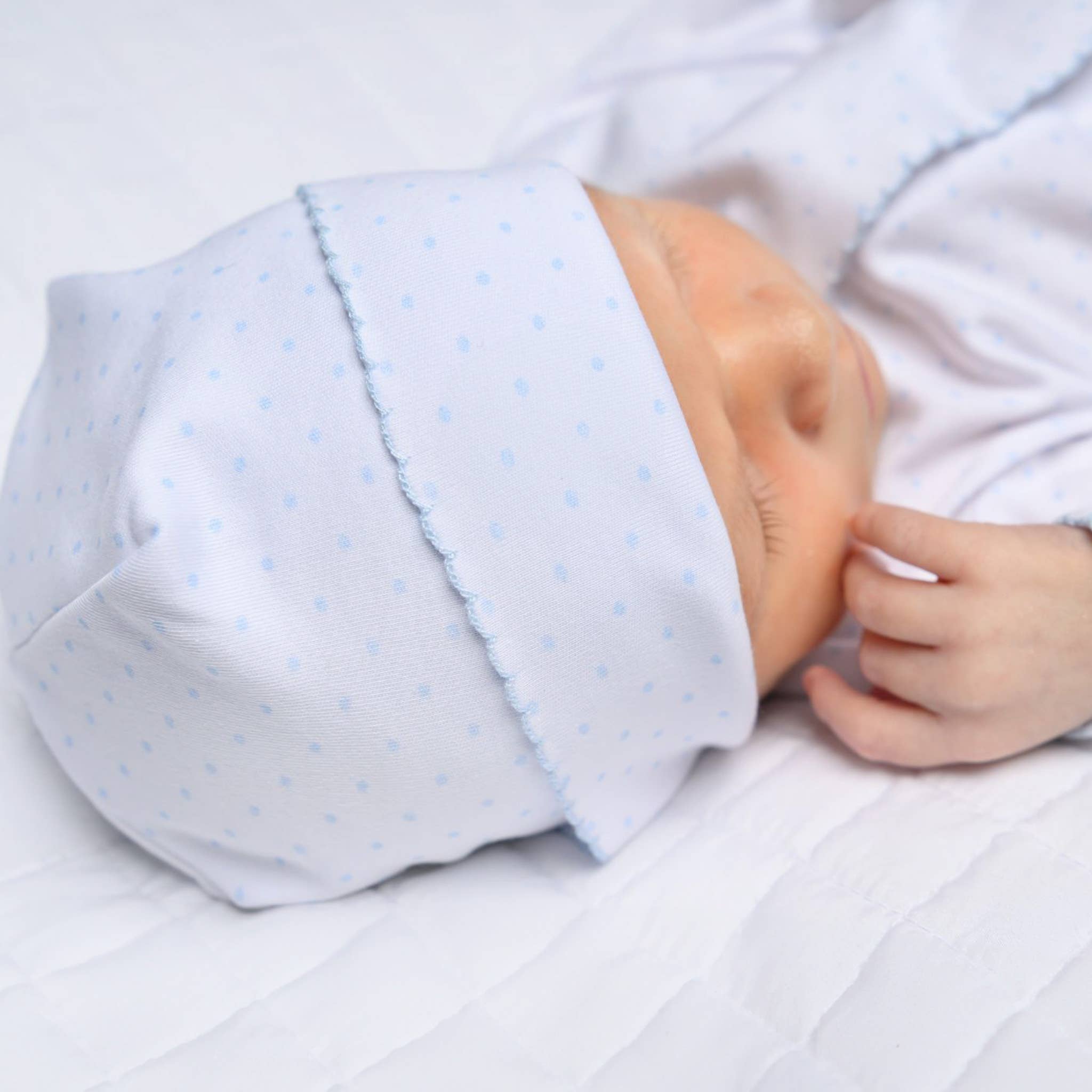 Introducing the Mini Dots Hat in Blue by Magnolia Baby, a brand recognized for its commitment to comfort, style, and luxury. This adorable newborn knit hat is made from the highest-grade 100% Pima cotton, ensuring the softest touch for your baby's delicate skin. With a charming mini dots design, it adds a dash of sophistication to any outfit, keeping your little one stylish and cozy. Magnolia Baby continues to provide smart, functional designs without sacrificing attention to detail, making this hat an excellent choice for your baby's everyday wear and special occasions.