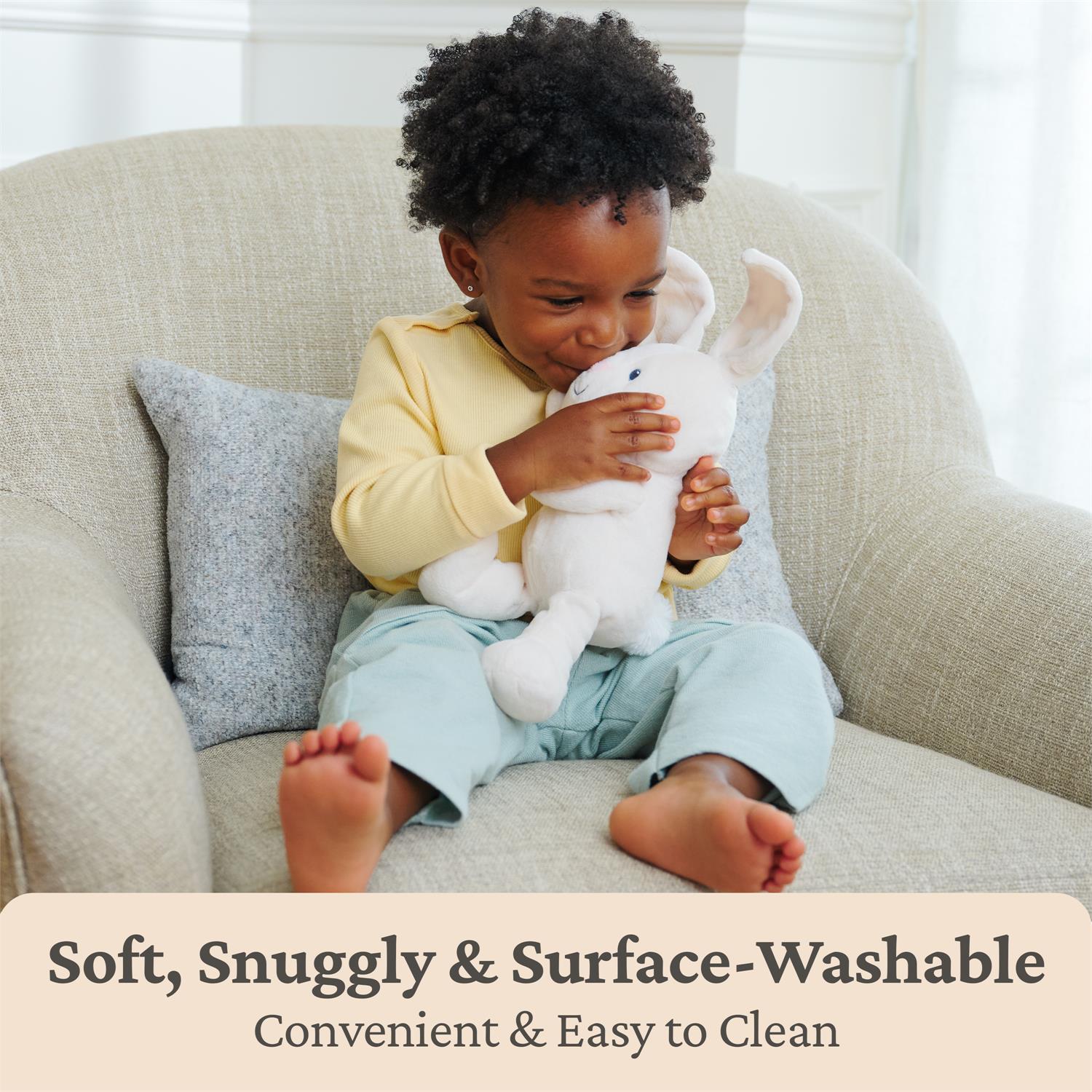 Flora is here in an all-new format! This classic award-winning plush bunny is here in a smaller, travel-friendly size with a simpler squeeze-and-play feature that everyone can use to play peek-a-boo with baby. Simply press her tummy with a gentle squeeze and her ears flop downward, covering her eyes to hide and leaving you in control of the game. Her long ears then pop back up as soon as you release the pressure, letting you decide when the surprise occurs. Customize every peek-a-boo session to your little one`s preferences and speed, using Flora to bond in a whole new way! Flora`s new 7 size and floppy limbs enable her to sit upright for display or let her legs dangle down playfully, making an adorable baby shower gift and cuddly soft toy. This innovative baby toy was also made thoughtfully, with the whole family in mind: with only minimal pressure needed to press her tummy, everyone can play comfortably and easily, from siblings all the way to grandma! Customize play time to your little one`s preferences and speed, using Flora to bond in a whole new way! Batteries not required. All details are embroidered and safe for little ones aged 0 and up. Hand-wash only. Ships in a protective poly bag.
