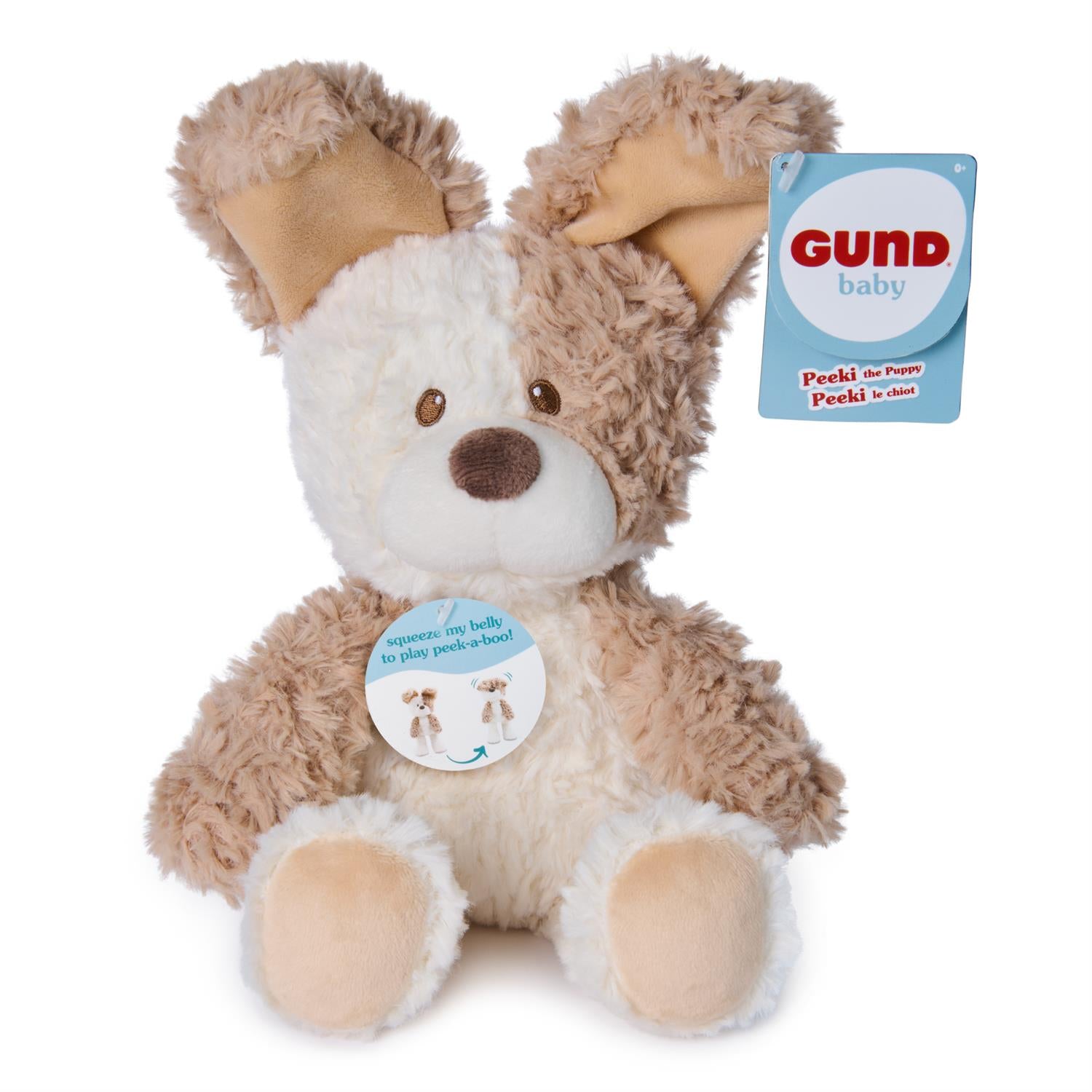 - Peek-a-Boo Peeki Plush: Peeki the Puppy is here in a fun, floppy 7` new format! Simply press Peeki`s soft tummy with a gentle squeeze and its ears flop down, covering its eyes to hide in an exciting game of peek-a-boo that you customize with baby!