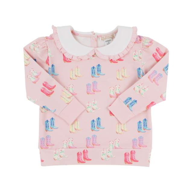 Maude's Ruffle Cassidy Comfy Crewneck Cute to Boot with Palm Beach Pink - 2T is backordered and will ship as soon as it is back in stock.