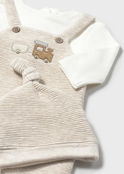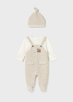 Long sleeved One-Piece for newborn baby boy. Round neckline. Designed with non-detachable dungarees. Back snap closure. Snap button fastening at crotch for easy dressing. Made from warm, elegant and sophisticated fabric to wear on the most special occasions. Garment with stretch leg.