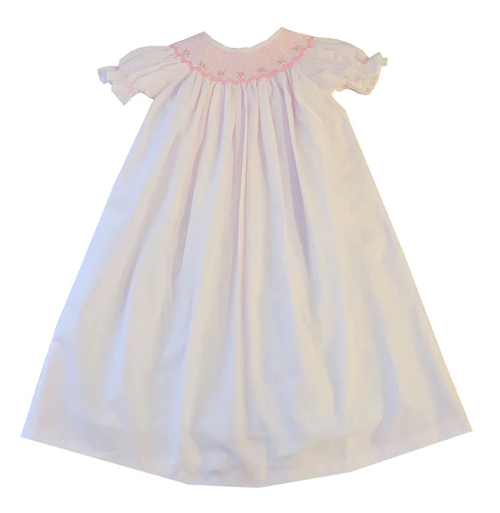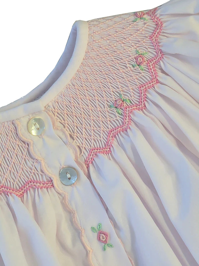 Pink gown with hand smocking. The gown has button closures going down the center front of the gown. Around the buttons are embroidered roses. At the cuffs of the sleeves there are also hand embroidered roses.