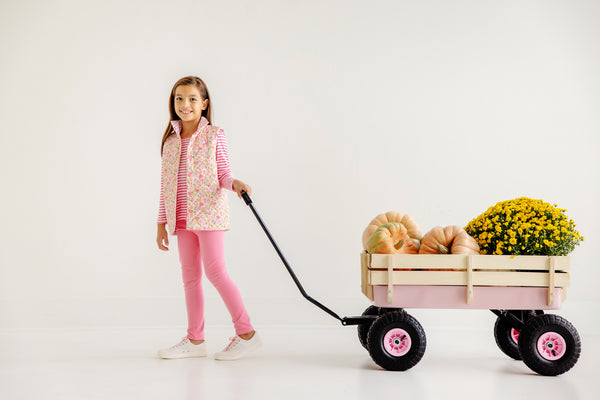 Your little lady will adore this Vaughn Vest for those chilly days to come. Featuring Grand Cayman Gardens with Romany Rose Stripe & Romany Rose Stork, she's sure to be the most stylish little girl around!