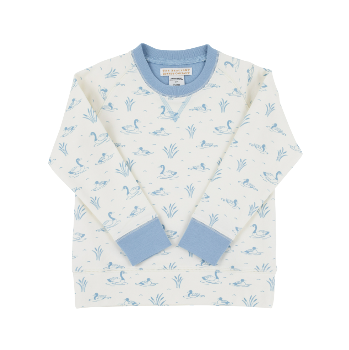 Cassidy Comfy Crewneck Boys Quack Quack Honk (Palmetto Pearl) with Barrington Blue - 18/24M is backordered and will ship as soon as it is back in stock.