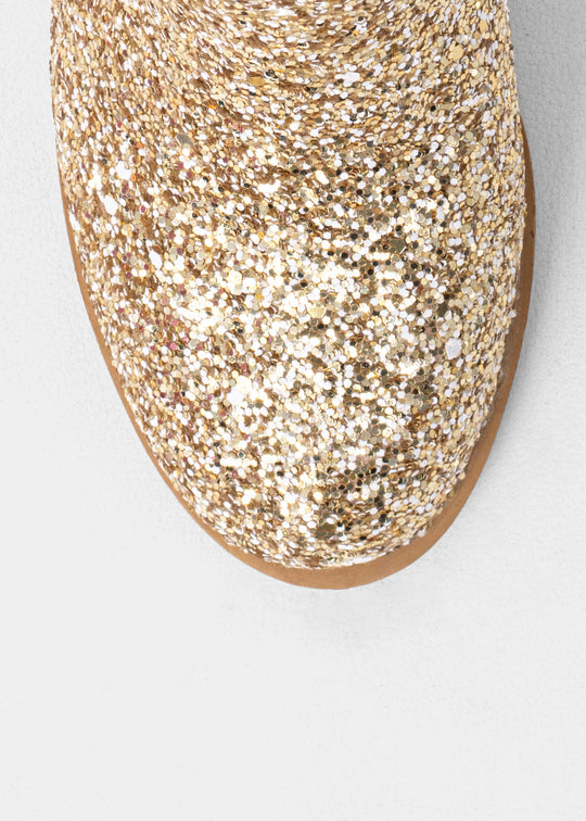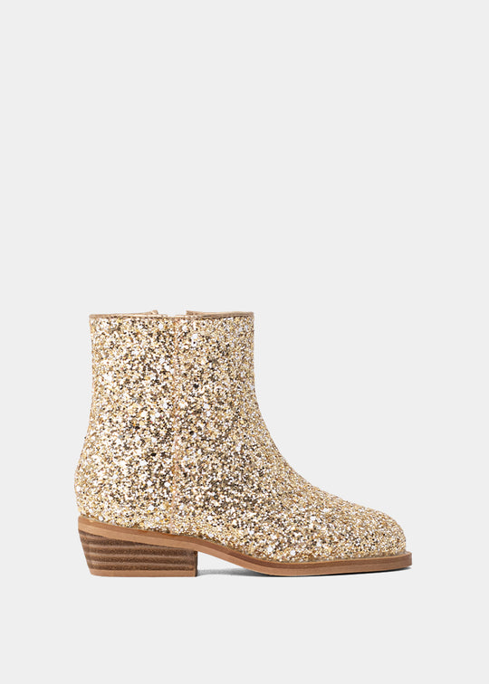 This one’s for the tiny trendsetters. VANILLA MINI in Gold Sparkle is a glam boot made to shine bright on every step. Covered in golden glitter with a low stacked heel and easy pull-on silhouette, it’s the kind of shoe that turns errands into catwalks. Whether it's dress-up day or just because, this is sparkle without the scratch.