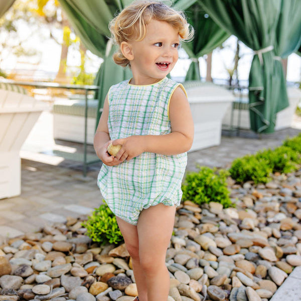 Celebrate timeless Southern style with our Benjamin Bubble featuring classic Gibson Island Green and Lake Worth Yellow Sewanee Seersucker, designed with a sweet bubble silhouette perfect for your little gentleman. Crafted from premium seersucker fabric with Lake Worth Yellow trim, thoughtful details, and convenient snap closures, this charming one-piece is ideal for special occasions, family gatherings, and creating picture-perfect moments. A wardrobe essential that brings preppy sophistication and comfortable wearability to every celebration.