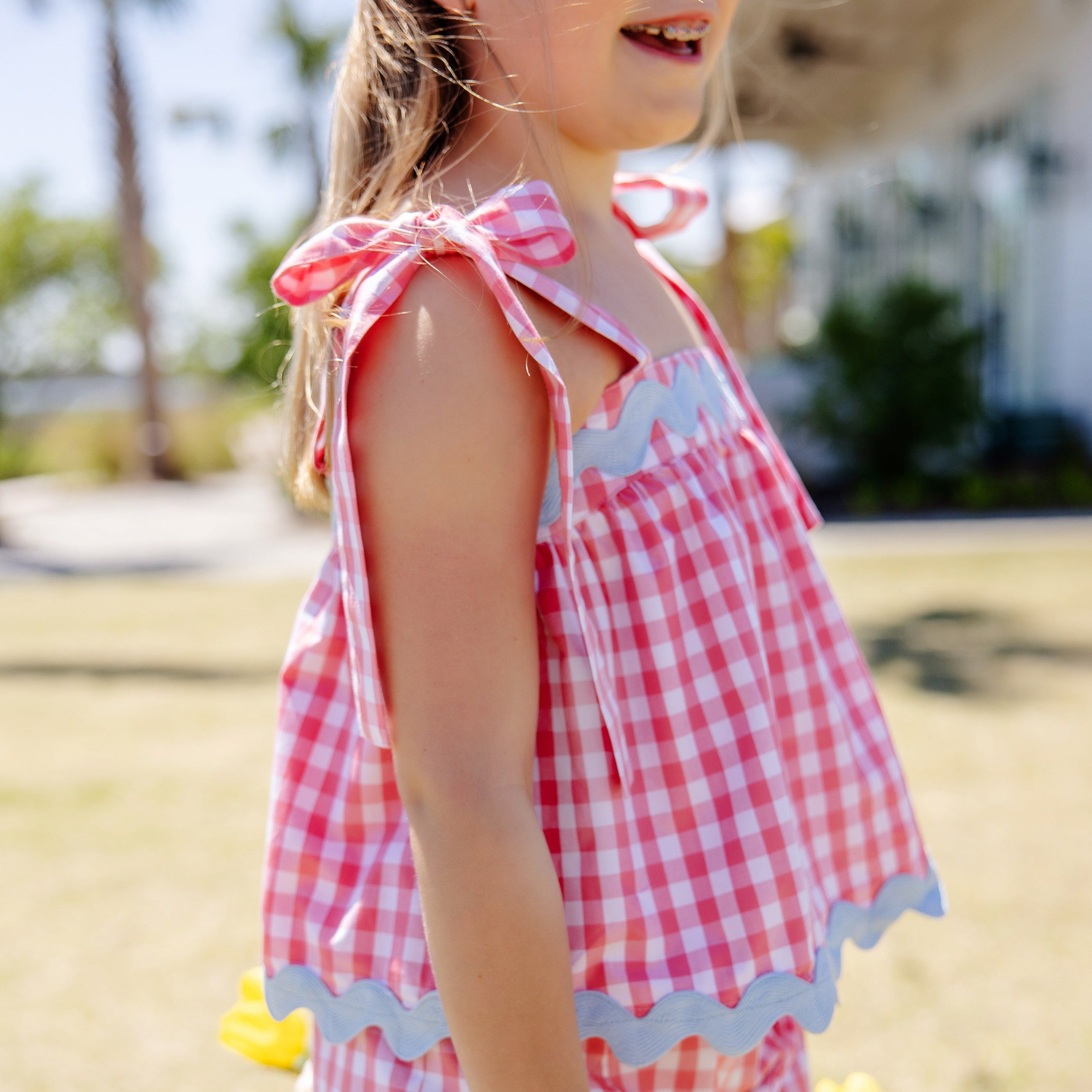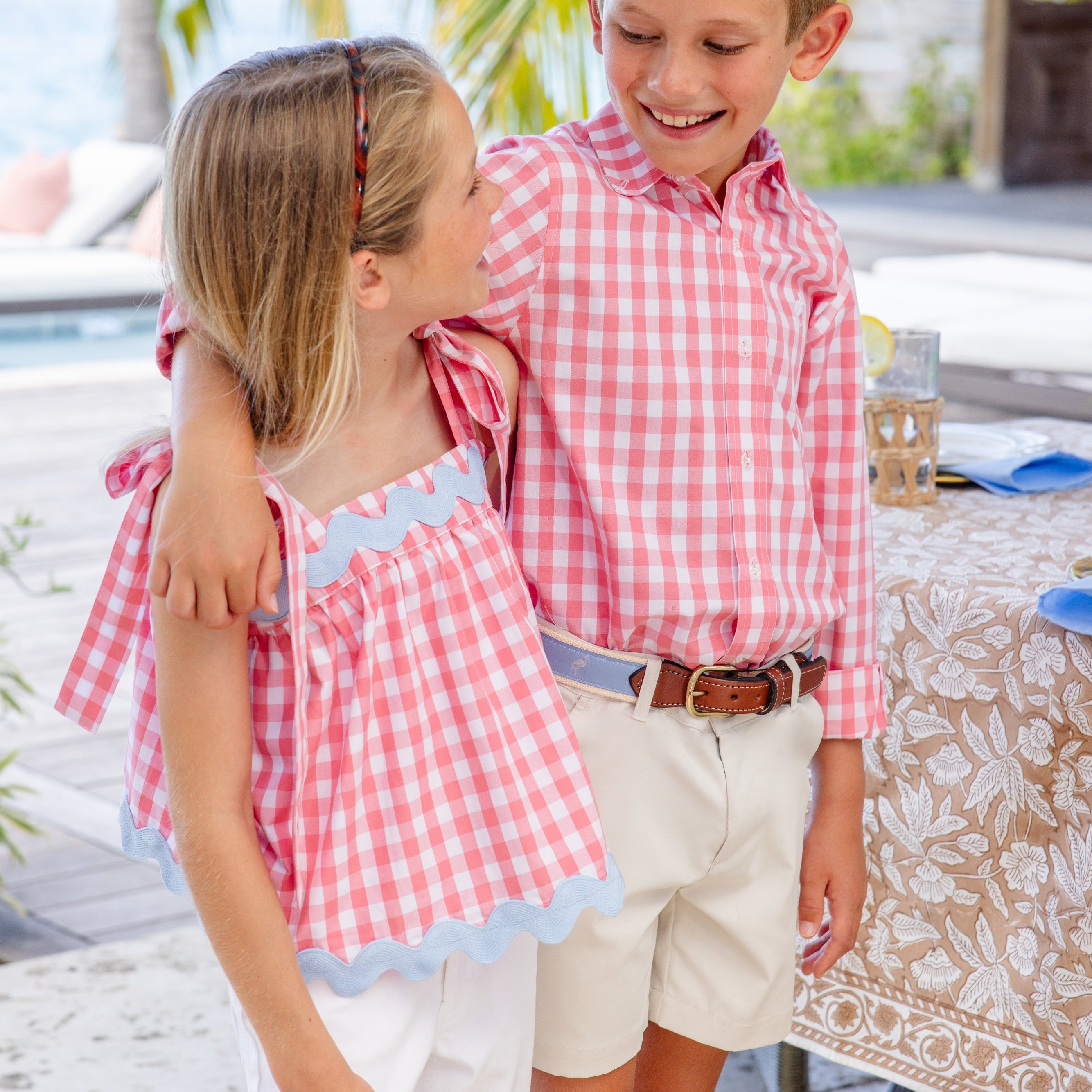 The Tyler Tie Top combines playful style with practical design for active children. Featuring a vibrant coral check pattern accented with Beale Street blue, this versatile piece transitions seamlessly from casual playdates to weekend adventures. The tie-top detail adds a charming, adjustable fit that grows with your child, while the quality construction ensures durability through countless washes. Perfect for layering or wearing solo, this top brings color and personality to any kids' wardrobe.