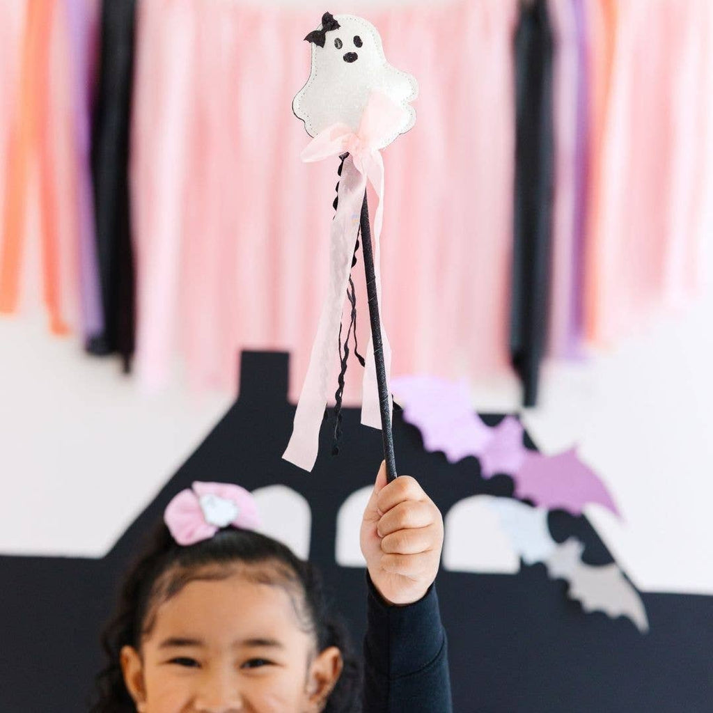 Add a sprinkle of enchantment to your Halloween with the Coquette Ghost Halloween Wand! This charming wand features a white glittery ghost adorned with a ballet pink ribbon, while black wavy ribbons cascade for a whimsical touch. The handle is neatly wrapped in matching ribbon, making it comfortable to hold. Designed for kids aged 3 and up, it pairs perfectly with a Sweet Wink tutu and shirt for an adorable, magical look from head to toe!