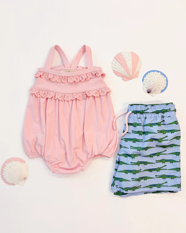 St. Bart's Bubble Bathing Suit in Palm Beach Pink combines timeless island style with practical design for young swimmers. The signature bubble texture adds visual interest and gentle texture, while the soft pink hue evokes tropical sophistication. Crafted for comfort and durability, this one-piece suit features a flattering silhouette that moves with active children. Perfect for beach days, pool parties, or resort vacations, it's a versatile piece that transitions seamlessly from water play to casual wear. UPF protection helps shield delicate skin from sun exposure, making it both stylish and functional for year-round water activities.