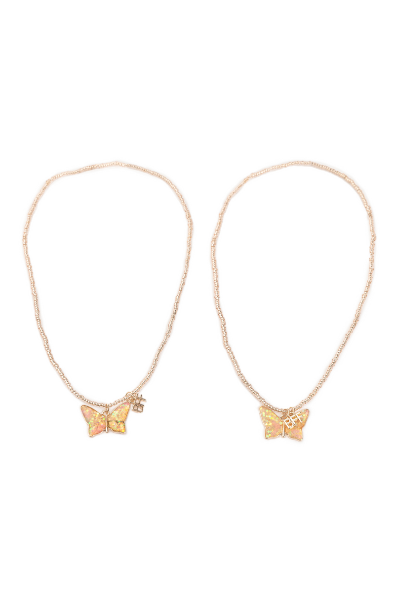 Butterfly necklaces made just for best friends! this set of 2 necklaces are made with clear iridescent beads with batching butterfly and BFF charms! This set makes the perfect gift for best friends or siblings!