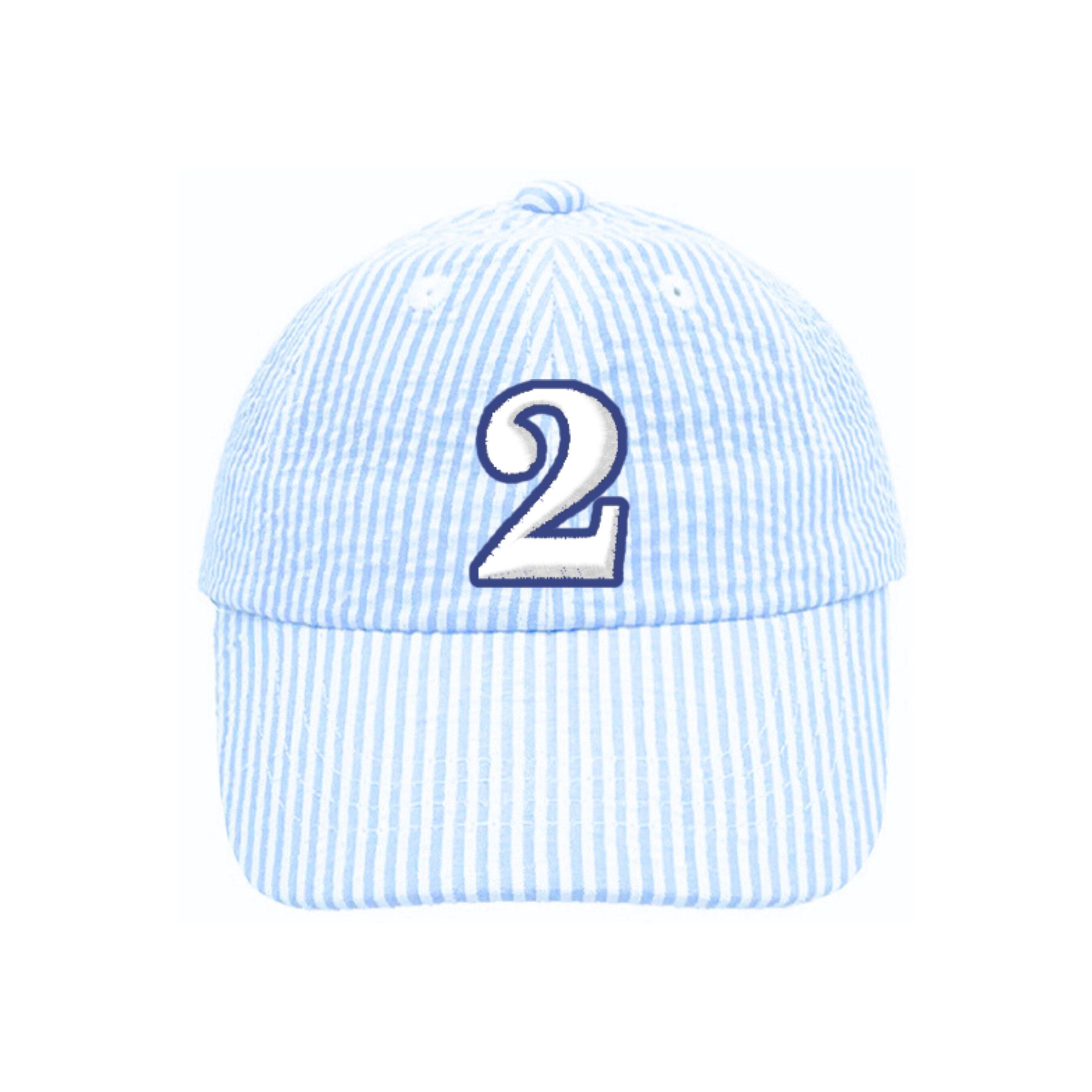 Mark this milestone moment with a sophisticated blue seersucker baseball cap featuring a bold '2' embroidery. This soft-structured six-panel design combines comfort with refined style, complete with an adjustable tuck strap and secure metal slide closure. Perfect for birthday celebrations and everyday wear.