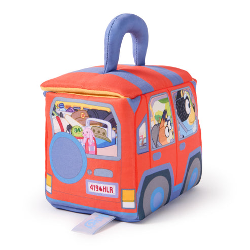 Take Bluey, Bingo, and their favorite toys on an adventure in the Heeler family vehicle! This innovative playset features Bluey, Bingo, and their favorite toys, Chattermax and Floppy bunny, all in a cute 7” plush car that brings the excitement of adventure to life with printed illustrations of Bluey’s family on a road trip. Bluey’s family car neatly stores 4 soft sensory toys: soft mini Bluey and Bingo plushies, a Chattermax squeaker toy, and a Floppy bunny plush that delivers a satisfying crinkle when squeezed. Each of these sensory-stimulating plush toys is designed with a special feature that encourages imaginative play while little ones engage in tactile fun, helping develop their dexterity and hand-eye coordination. The soft carrying bag is perfectly sized for little hands and makes for easy travel and storage when not in use or on the go. It is also crafted with exclusively embroidered and printed details, making it a fun choice for all ages, babies and toddlers ages 1 and up. With so many different sounds and textures, it’s an exciting way to encourage little Bluey fans to touch, discover, imagine, and enjoy their own imaginative adventures at home!