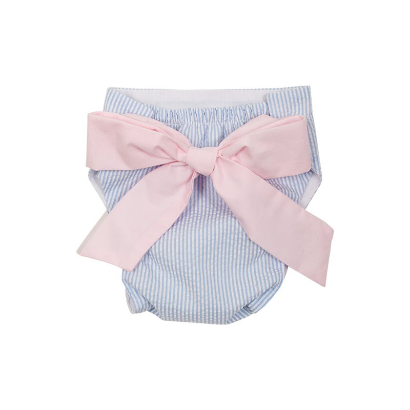 Bow Bottom Bloomer Breakers in crisp blue seersucker with charming Palm Beach pink accents—the perfect blend of preppy style and playful comfort for your little one. These bloomers feature adorable bow details at the legs and a flattering fit that's ideal for warm weather adventures, beach days, or dressed-up occasions. Soft, breathable fabric keeps kids cool and comfortable all day long. A timeless piece that pairs beautifully with any summer wardrobe!
