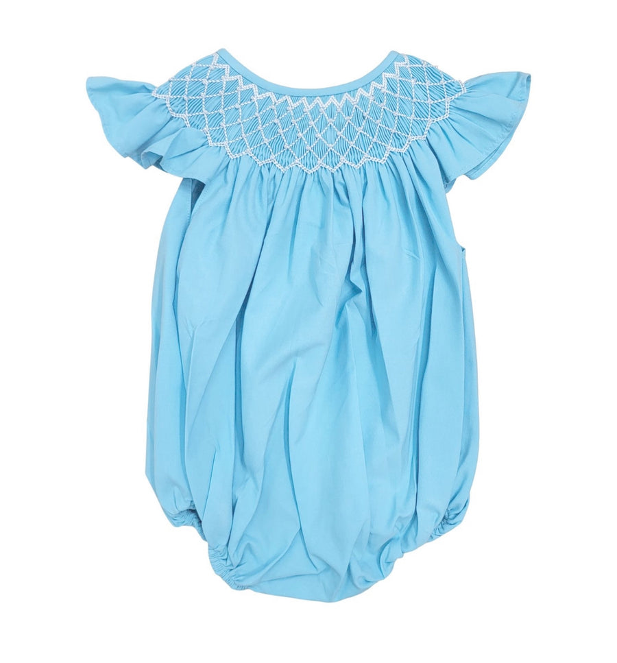 Introducing the Catherine Pearl Aqua Smocked Bubble - a fun, quirky outfit for your little one! With smocked detailing and a playful aqua color, this bubble is perfect for any occasion. Get ready to make a splash with this unique and stylish piece!
