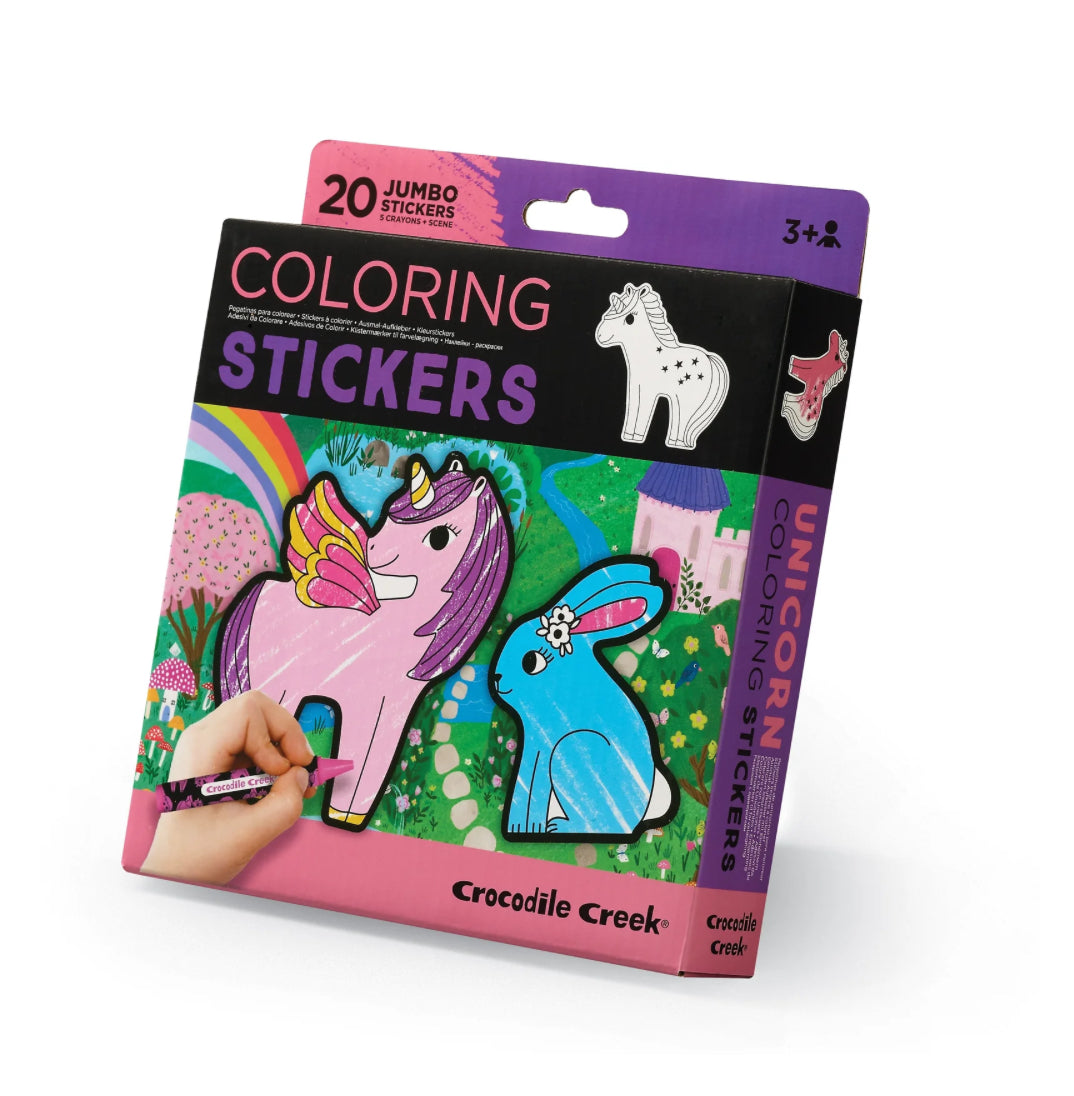 Crocodile Creek's coloring sticker sets are great fun for kids. Each set includes 20 jumbo stickers to color (each approximately 6" high), as well as crayons, and an illustrated scene to display the stickers once they're done.