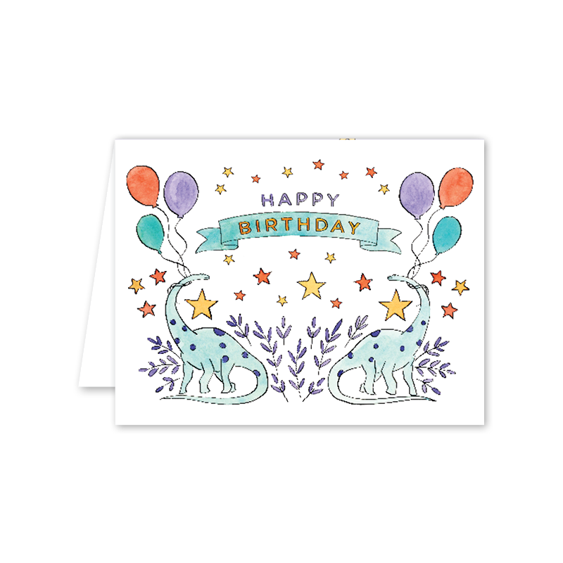 Celebrate with this thoughtfully designed greeting card featuring artwork by Rachel Rogers. Measuring 4.25 by 5.5 inches when folded, it's crafted on premium Mohawk Eggshell White Paper for a refined finish. The card arrives with a coordinating Euro flap envelope and offers a blank interior, providing the perfect canvas for your personal message. Ideal for dinosaur-themed birthday occasions.
