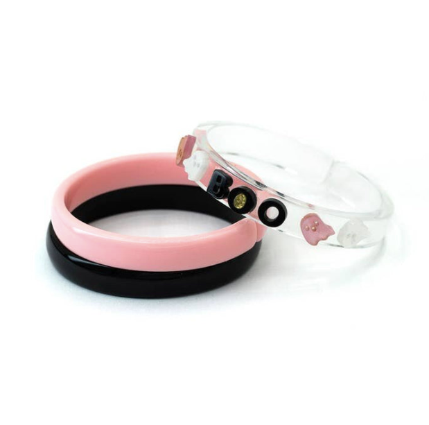Bring spooky charm to Halloween with the Ghost Boo Glitter Gold Bangle Set. These colorful acrylic bangles sparkle with cute ghost "Boo" accents, making them a playful favorite for little ones. Lightweight and vibrant, they’re perfect for adding festive fun to any outfit.