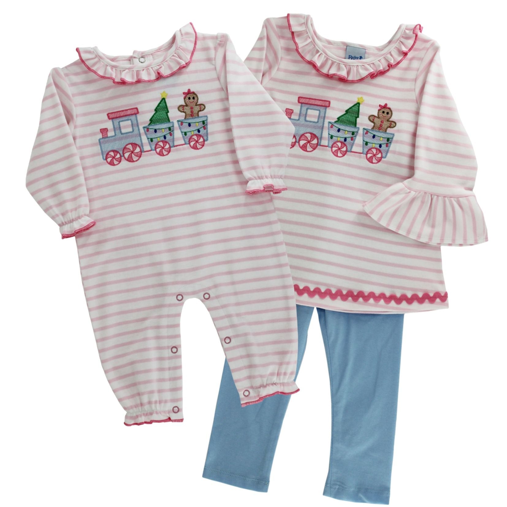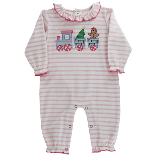 Get ready for holiday cheer with the Gingerbread Express Knit Romper! This festive one piece features an adorable gingerbread train design with cozy long sleeves and soft knit fabric for all day comfort. Snap closures make changing quick and easy while cheerful holiday colors make it perfect for family photos or just lounging in seasonal style. It’s a sweet choice for your little one’s first Christmas memories.