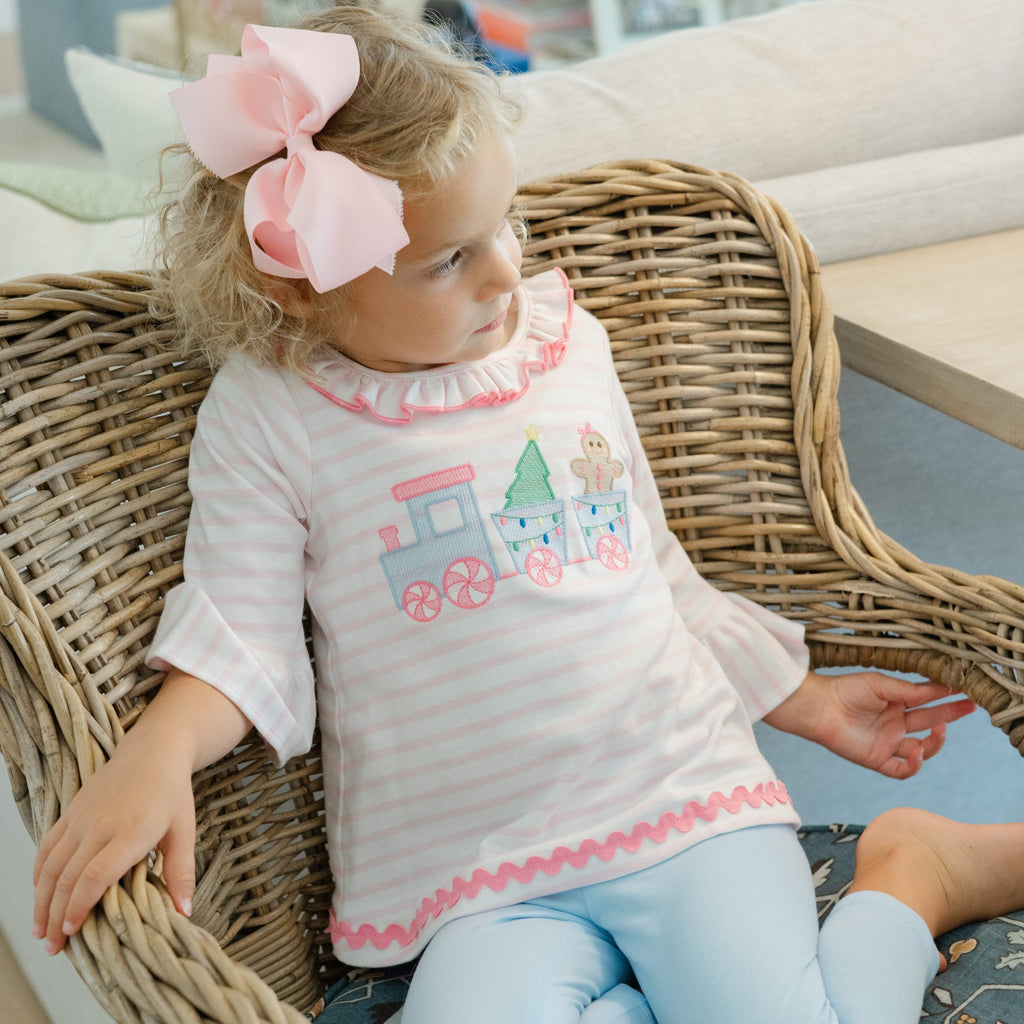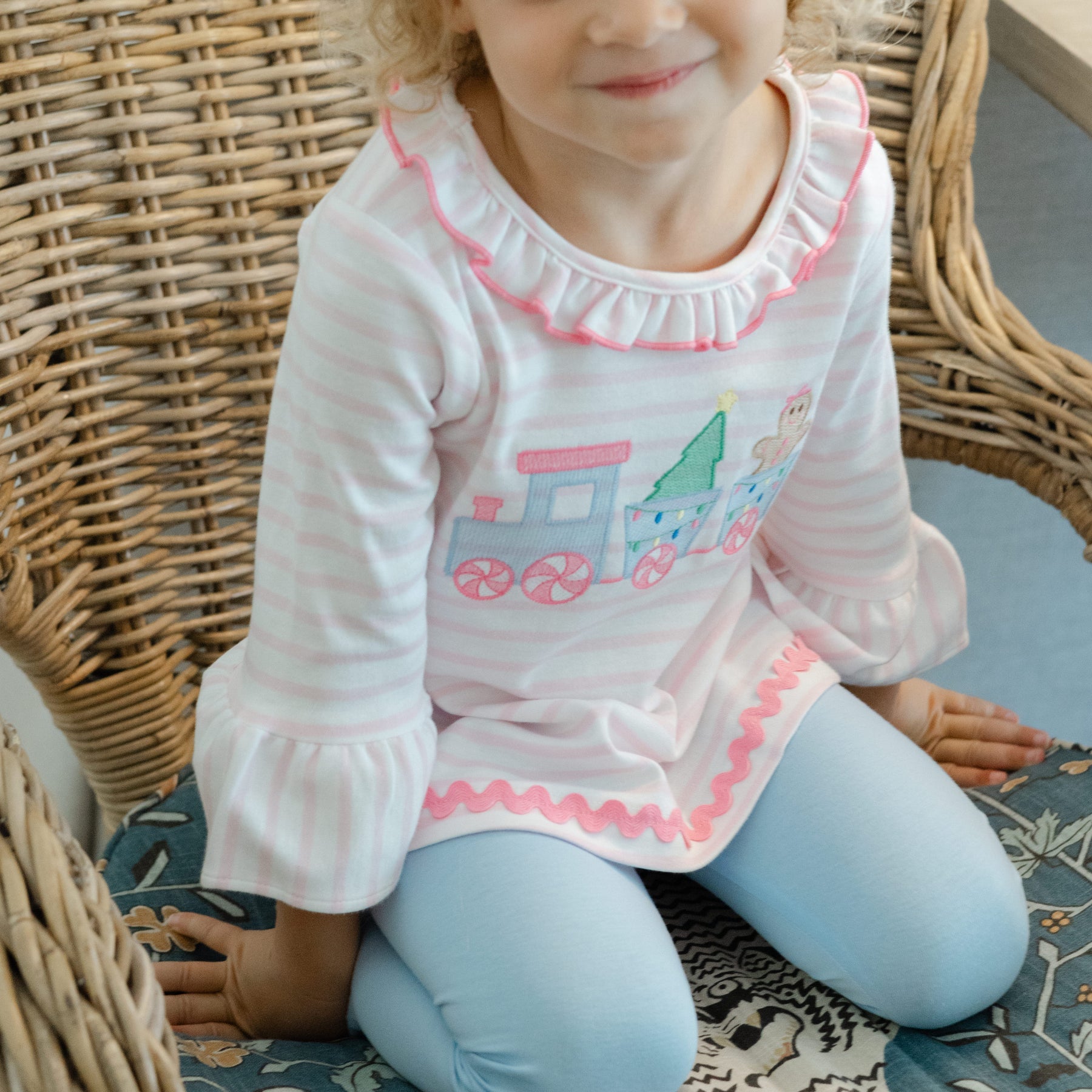 Sugar, spice, and everything nice! The Gingerbread Express Tunic Pant Set features a playful gingerbread train on a long sleeve tunic top which is paired with comfy and festive pants. Ruffle accents and vibrant holiday colors add extra charm that makes this outfit a favorite for Christmas parties and cozy winter days. The soft and breathable fabric keeps her comfy while she enjoys the season in style.