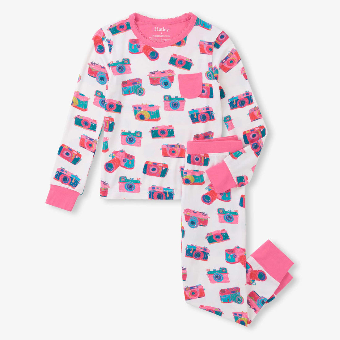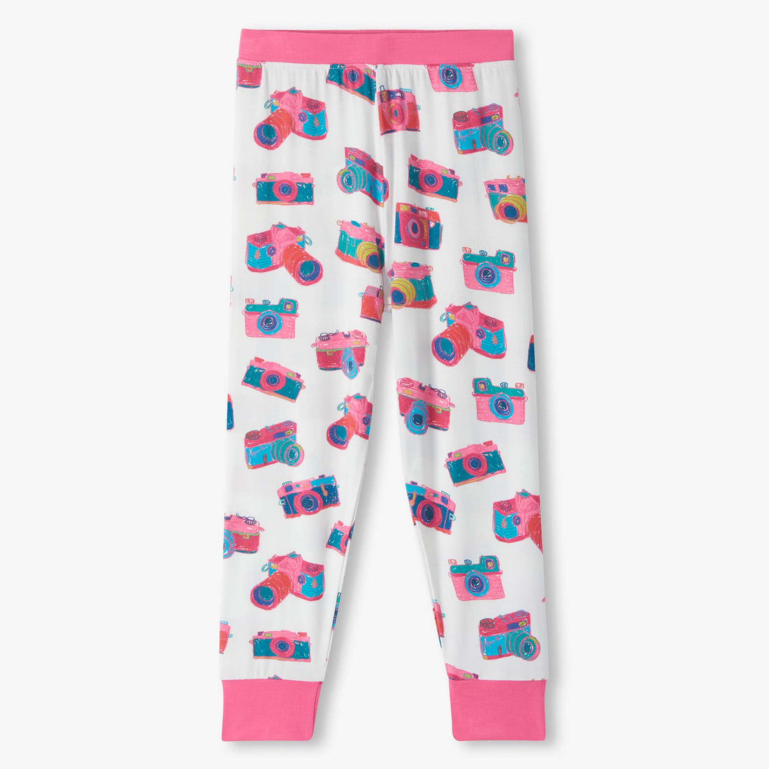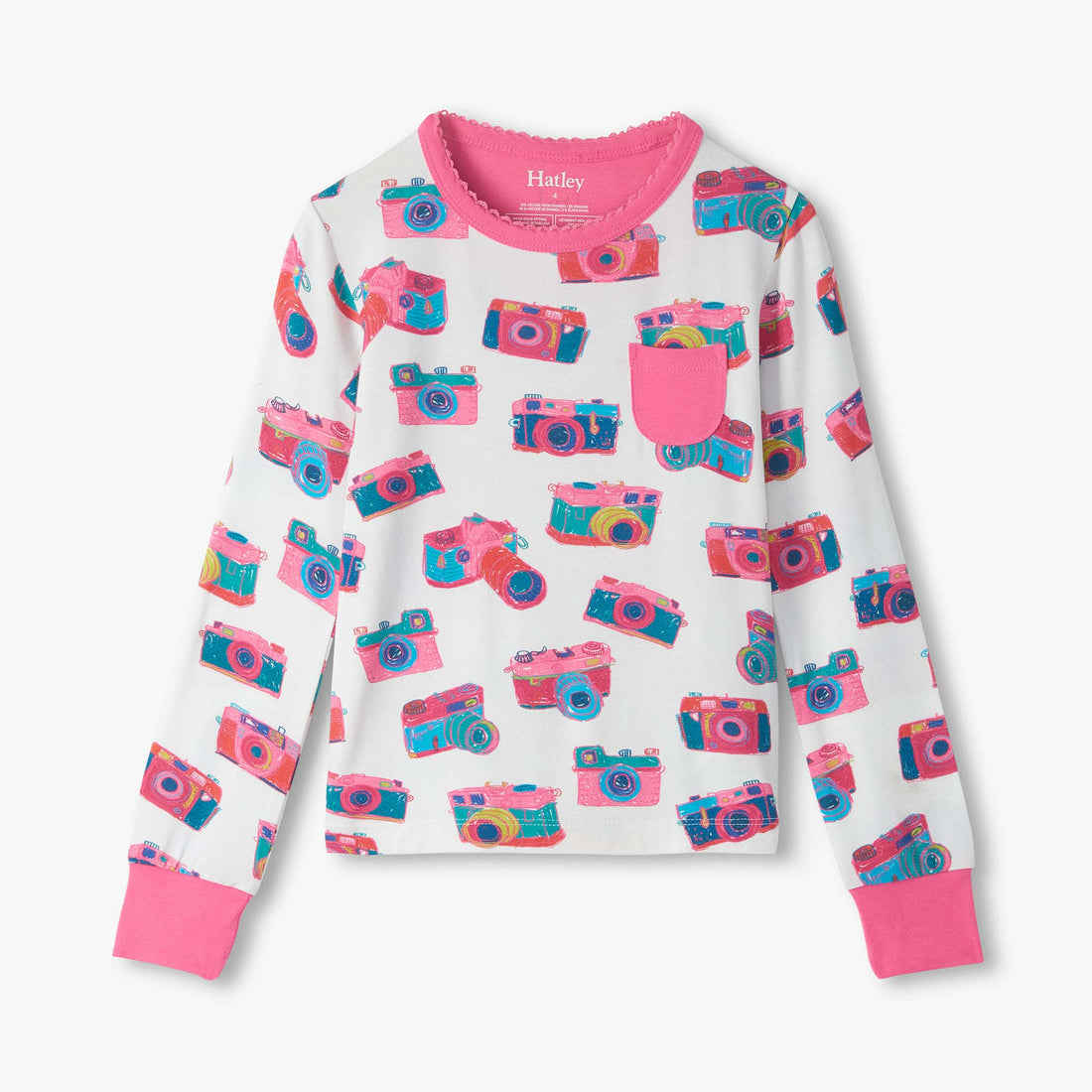 Crafted from breathable bamboo-viscose fabric, this ultra-soft long-sleeve pajama set keeps them cozy and cool through the night. The white background features a high-contrast, multicoloured all-over print of hand-drawn camera motifs, perfect for little dreamers with a creative spark. Pink ribbed trim at the crewneck, cuffs, ankles, and chest pocket adds a playful flash of colour. Comfy, imaginative, and picture-perfect for bedtime!