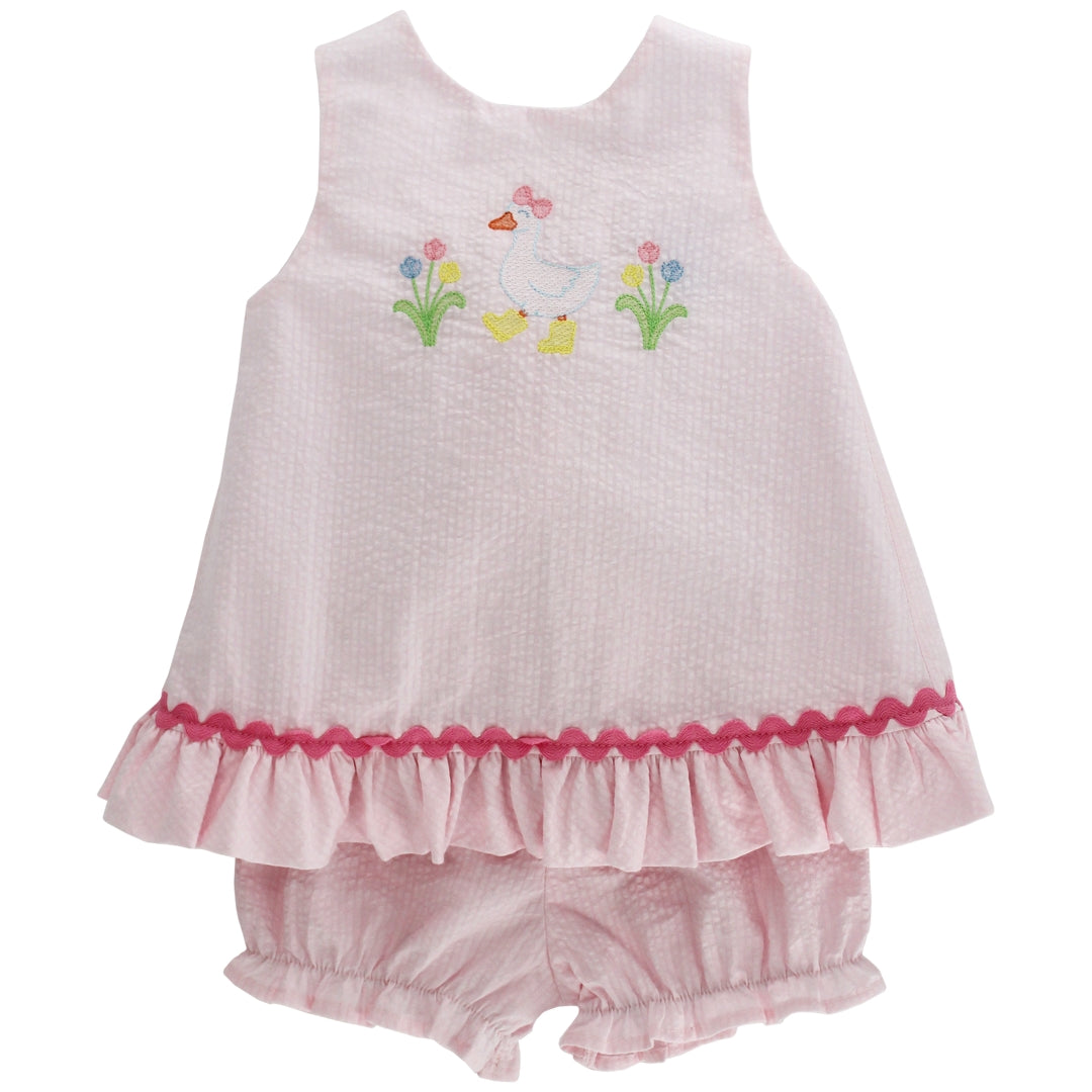 Whimsical and sweet, the Goose in Boots Angel Dress with Bloomer brings personality to her spring wardrobe. The embroidered geese add playful charm, while ruffled sleeves and ties create an heirloom feel. Perfect for Easter, portraits, or outdoor tea parties. A storybook look she’ll love to twirl in.