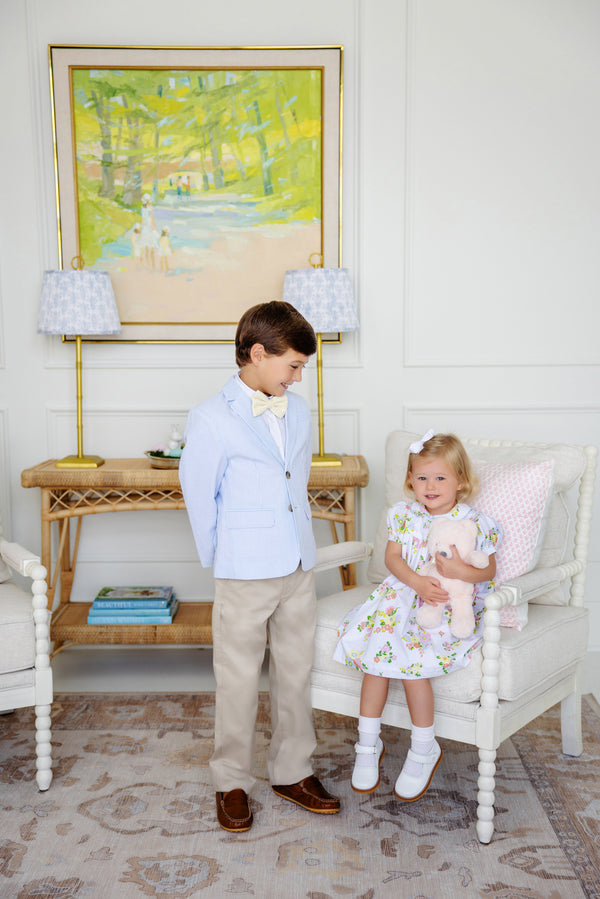 Our Grandccasion™ Booker Blazer in Breakers Blue Seersucker brings classic seersucker texture and tortoise shell button details that elevate his look from everyday to extraordinary. Whether he's headed to a spring celebration, family gathering, or just wants to look his absolute sharpest, this timeless piece delivers polished style that makes every moment feel special. Preppy perfection!