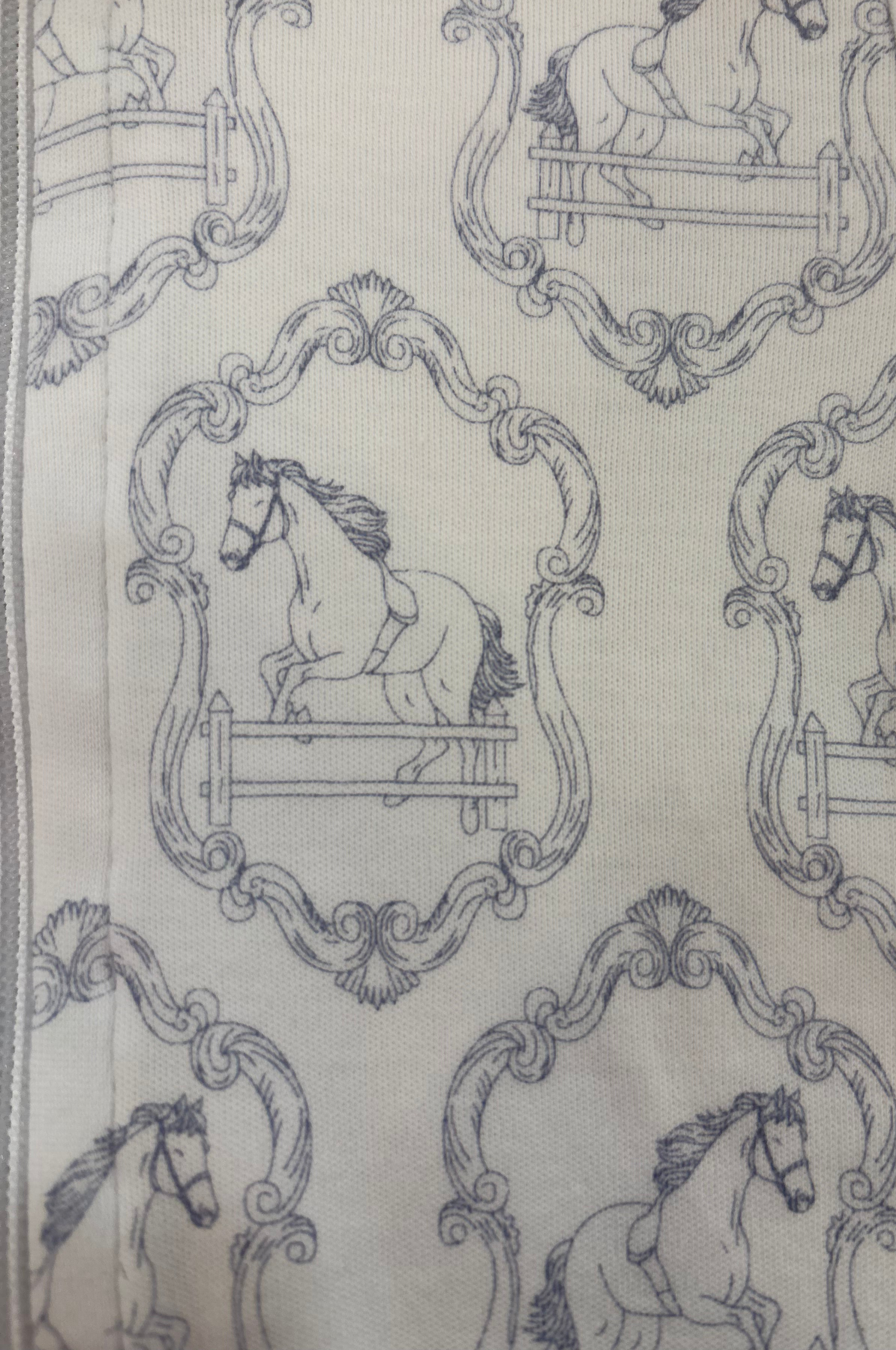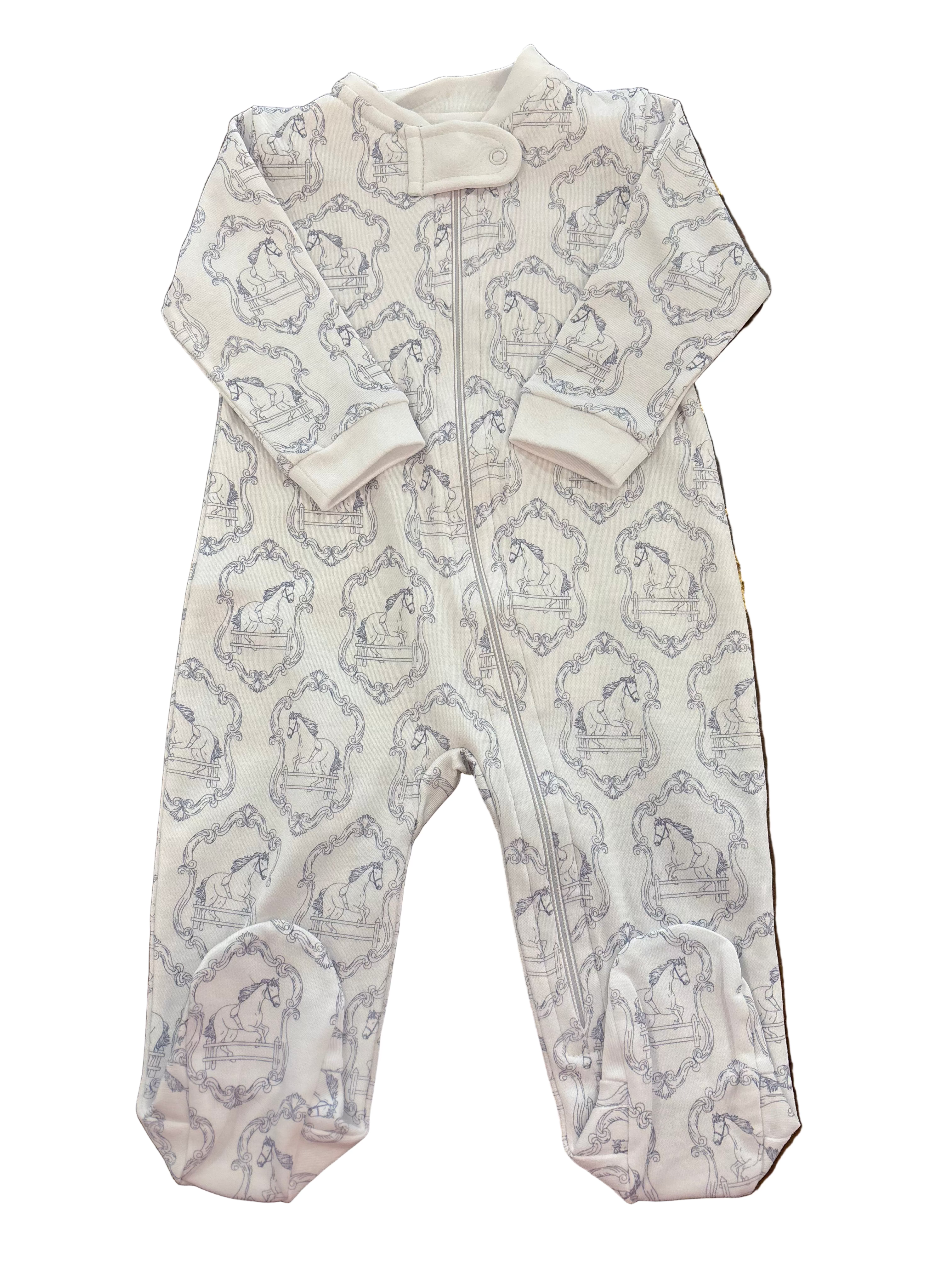 Let your little one drift off to dreamland in style with our Horses Toile De Jouy Zipper Footie! Featuring a charming toile de jouy print with prancing horses, this cozy sleepwear combines classic elegance with modern comfort. The convenient front zipper makes bedtime changes effortless for busy parents, while soft, breathable fabric keeps kids comfortable all night long. Perfect for sweet dreams and easy mornings!