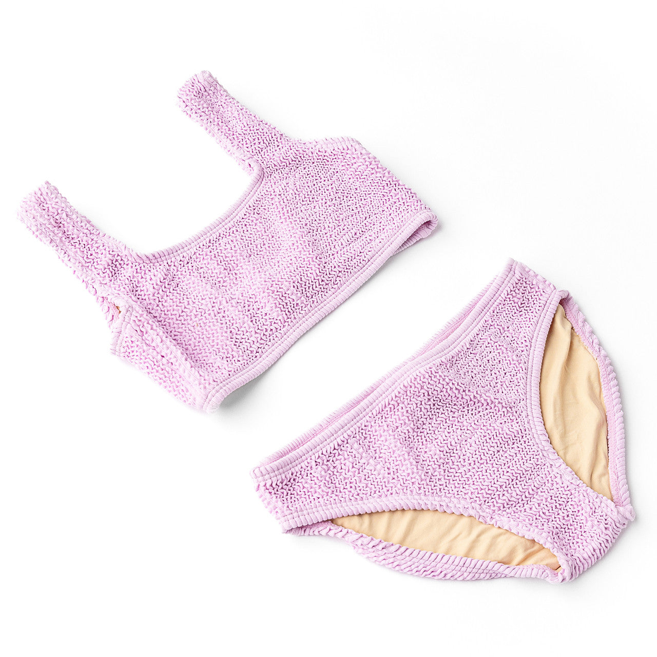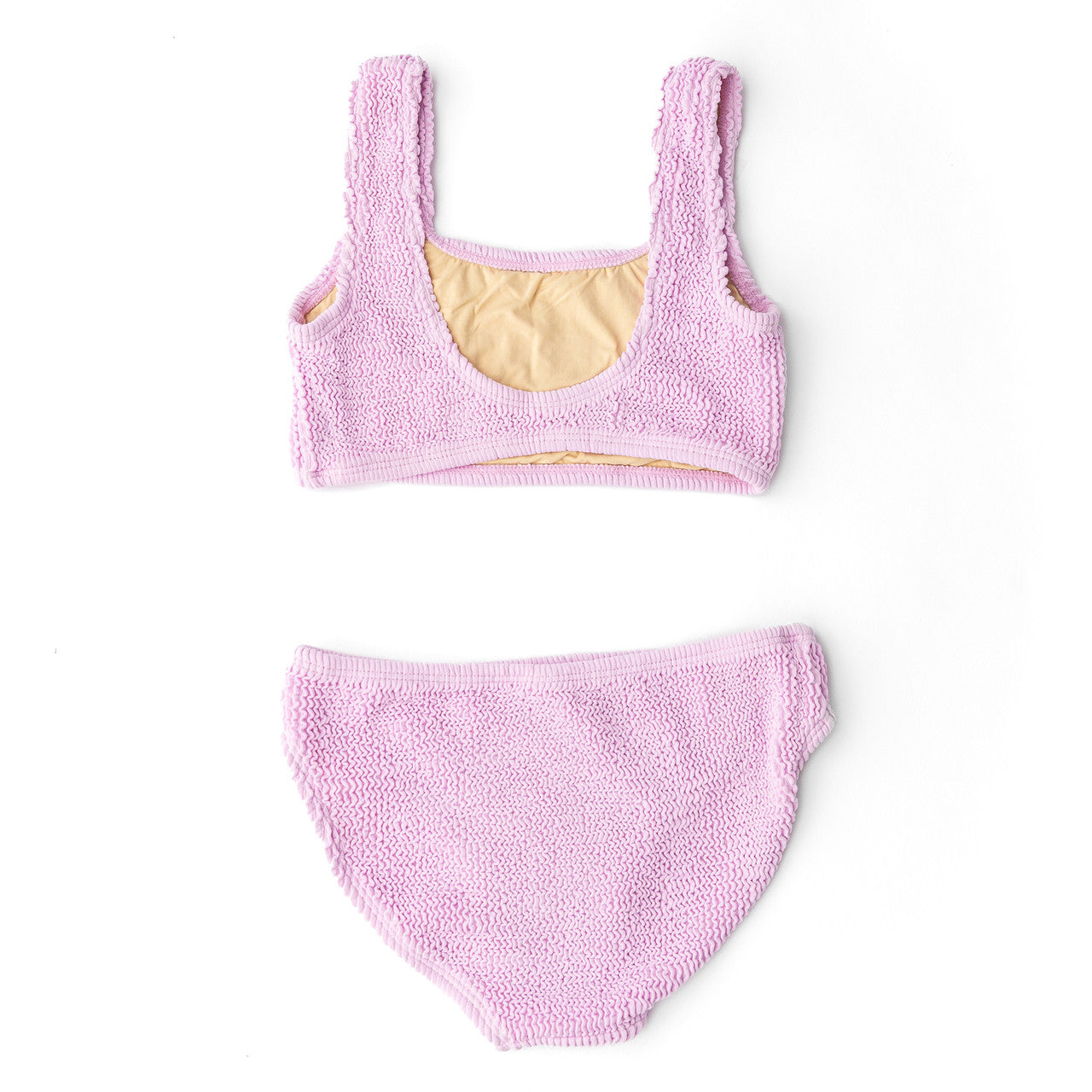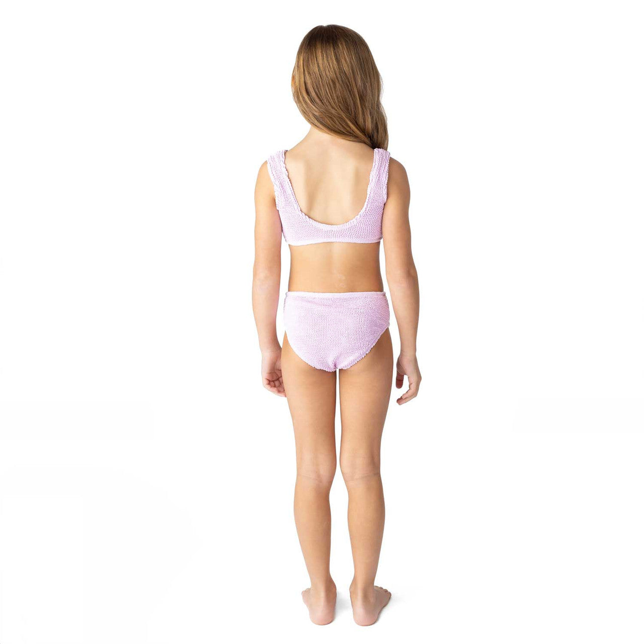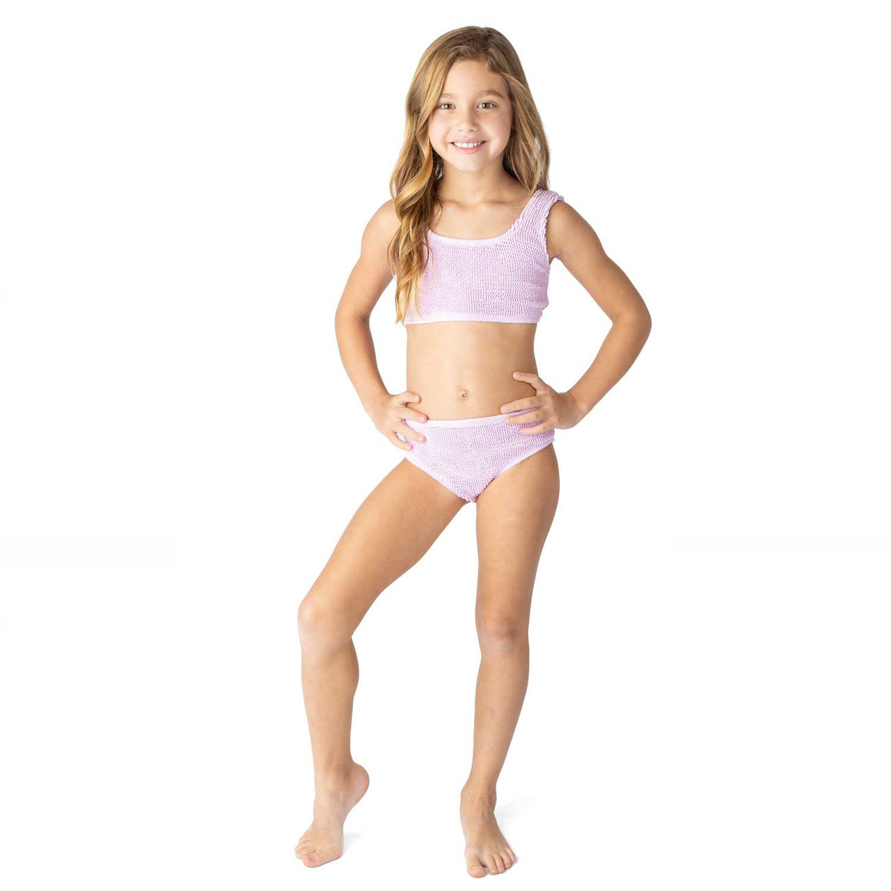 Freshen up her swimwear collection with the Lavender Crinkle Girls Two Piece Swimsuit. This stylish two-piece features a modern design with crinkle textured detailing, giving it a unique, playful twist that's perfect for sunny days at the beach or pool. The set is fully lined for ultimate comfort, ensuring a soft, secure fit throughout all of her water adventures. The flat zig-zag stitching provides durability and a sleek finish, while the full cut coverage on both the top and bottoms offers comfort and confidence, making it ideal for active girls who love to swim, splash, and play. Crafted from a blend of 93% Polyester and 7% Spandex, this swimsuit offers the perfect balance of stretch and support. With UPF50+ sun protective fabrics, it provides excellent protection from harmful UV rays, so she can enjoy the sun with peace of mind.