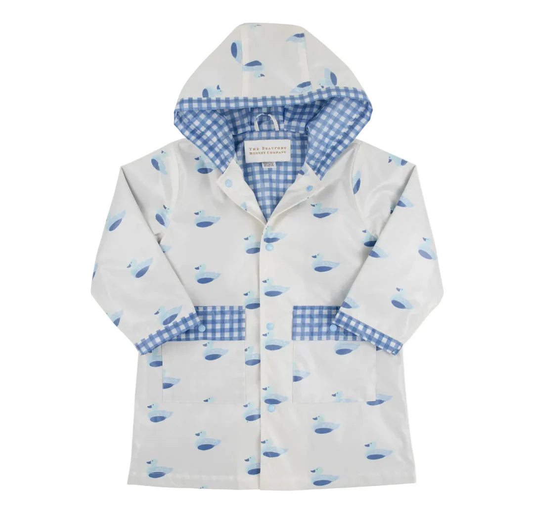 The Liquid Sunshine Slicker is back! Featuring errimack Quack Quacks with Park City Periwinkle lining, this jacket is sure to make even the gloomiest of days bright!