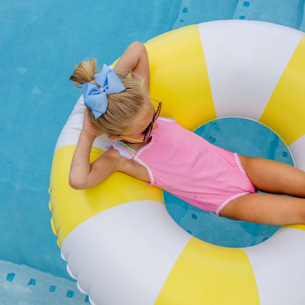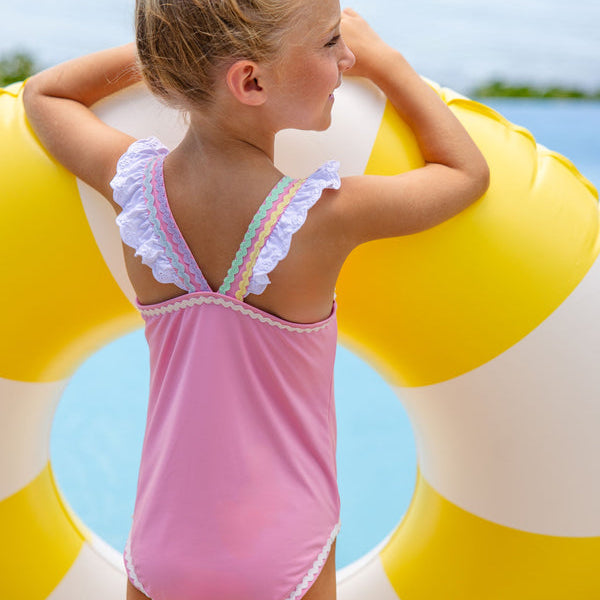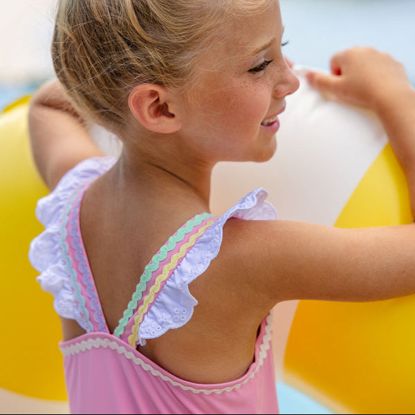 Our Long Bay Bathing Suit in vibrant Hamptons Hot Pink with Worth Avenue White & Multicolor Ric Rac brings coastal charm to her swimwear collection. This adorable girls' swimsuit features playful ric rac trim and quality construction that's perfect for pool days, beach vacations, and summer adventures. This piece is a swimwear favorite that makes every sunny day special.