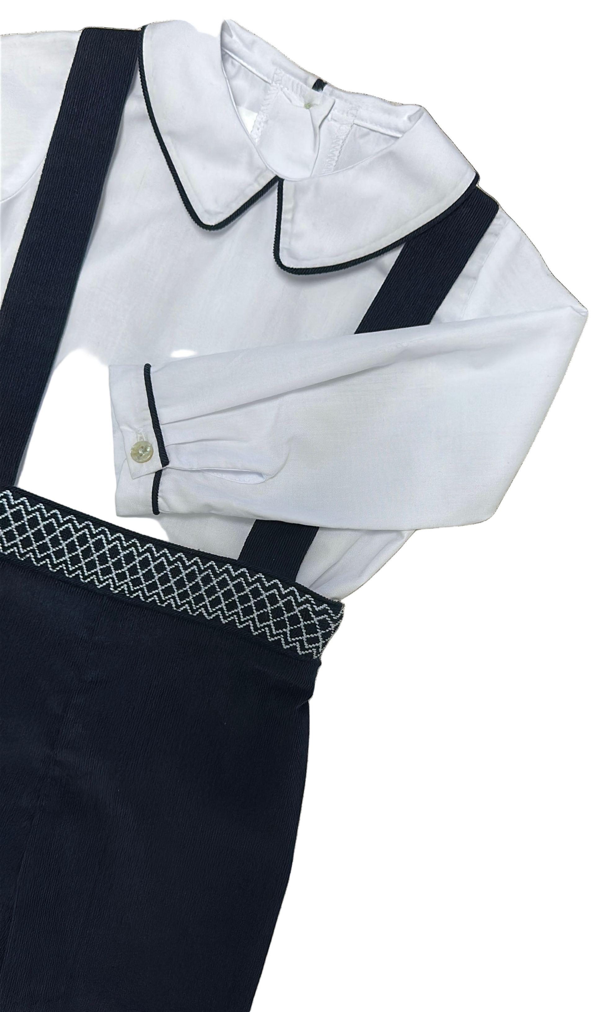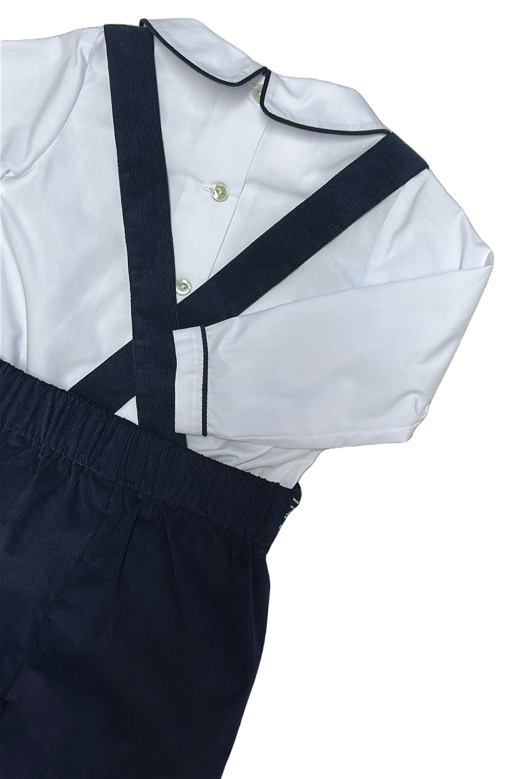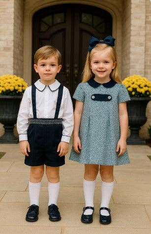 This charming two-piece boys' short set features hand smocking along the waist with a delightful traditional design, making it an adorable choice for welcoming the Fall season. Ideal for family photos and sibling gatherings, the shirt is crafted from a soft cotton blend and accented with navy piping, while the shorts are fashioned from smooth 21-wale corduroy for a comfy, stylish fit.