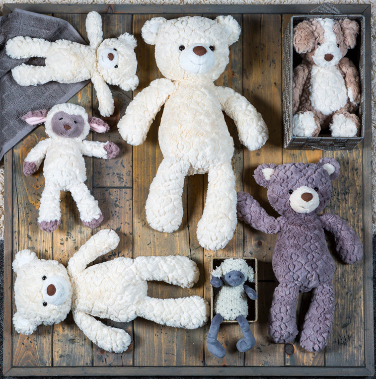 Putty Bear features super soft, etched cream fabric and measures 11-inches tall from the top of the head to the bottom of the feet. Sweet fabric face and plastic eyes. With lovely, warm colors and the sweetest smiles, Putty toys make oh-so-soft companions. A dab of Putty is enough to brighten every day.