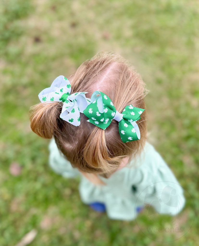 Sprinkle a little luck into her look with this festive shamrock print grosgrain bow, available in bright green with white clovers or classic white with green. With sizes ranging from Mini to King, it’s the perfect pinch-proof accessory for school celebrations, parades, and every St. Paddy’s Day adventure on her calendar. This bow is sure to stay in her hair all day with our patented WeeStay™ no-slip hair clip.