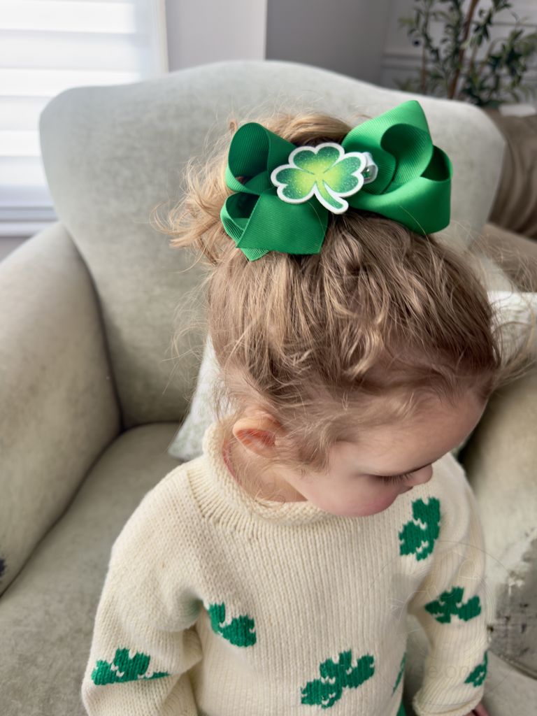A little green and a lot of sparkle—this shamrock glitter stacker clip is made to bring good luck (and style) to her St. Patrick’s Day look. With its bright glitter finish and festive 2" size, it’s the perfect pinch-proof accessory for school celebrations, parades, and all her lucky-day adventures. This bow is sure to stay in her hair all day with our patented WeeStay™ no-slip hair clip.