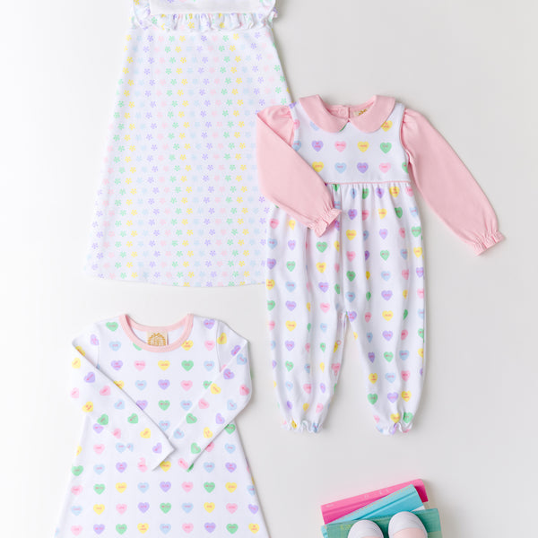 Full of love and charm, the Sleeveless Rebecca Romper in We Heart You with Palm Beach Pink is a sweet addition to her summer wardrobe. This girls' romper features an adorable heart print and a comfortable sleeveless design that's perfect for warm days, playdates, and sunny adventures. Lightweight, easy to wear, and absolutely precious, it's the playful one-piece that keeps her looking darling all season long.