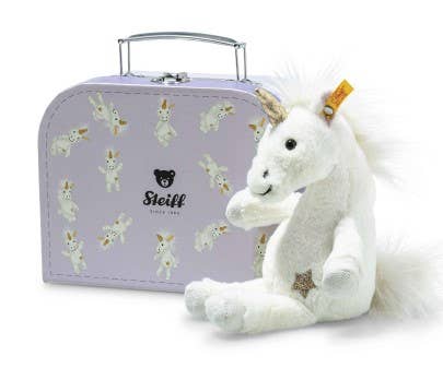 Unica dangling unicorn now has her own suitcase. Featuring fabulous unicorn motifs, it makes a wonderful addition. Unica is 20 cm tall and has little bean bags in her hooves and bottom. This makes her very stable and provides a wonderful sensory experience for children. The golden horn and golden star on her tummy will capture little hearts. Unica smiles happily and will whisk her young friends off on magical adventures. Made in Tunisia