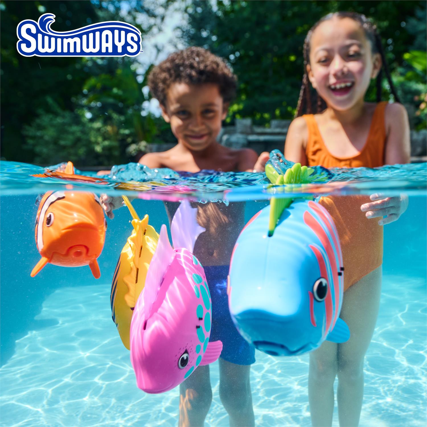 Turn your pool into a colorful tropical reef with the Swimways Rainbow Reef swimming pool dive toys! Dive under the water to see the magical world of Rainbow Reef come to life! These life-like fish toys paddle through the water in any direction, just like a real fish. This kids pool toy changes speeds as it swims, and moves up and down through the water, so you can chase them or swim alongside your aquatic friend. These water toys are great for everyday play, pool party games and to encourage the learn to swim process - kids won't even know they are building their underwater swimming skills! These kids toys for boys and girls are designed to be super easy to grab and carry, making them perfect to take to the lake, beach, bathtub and swimming pool! These pool dive toys are also perfect for pool party favors, pool party supplies and travel! Collect them all to build your tropical underwater world, with 4 colorful and fun designs that are easy to see under water! The SwimWays Rainbow Reef requires 2 AAA batteries, which are included so you can get right to the water fun! Recommended for children aged 5+