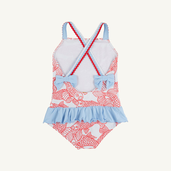Make a splash this season in the Taylor Bay Bathing Suit, featuring a vibrant Big Fish design in bold red and Beale Street blue. Perfect for pool days and beach adventures, this playful one-piece keeps kids comfortable and confident in the water. The eye-catching fish pattern sparks imagination while quality construction ensures durability through countless cannonballs and water games. Whether splashing at the beach or diving into the pool, this bathing suit brings fun and style to every water outing.