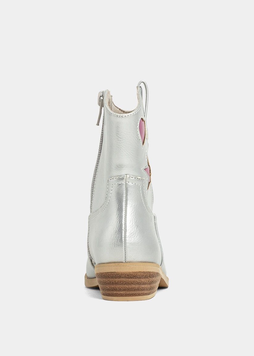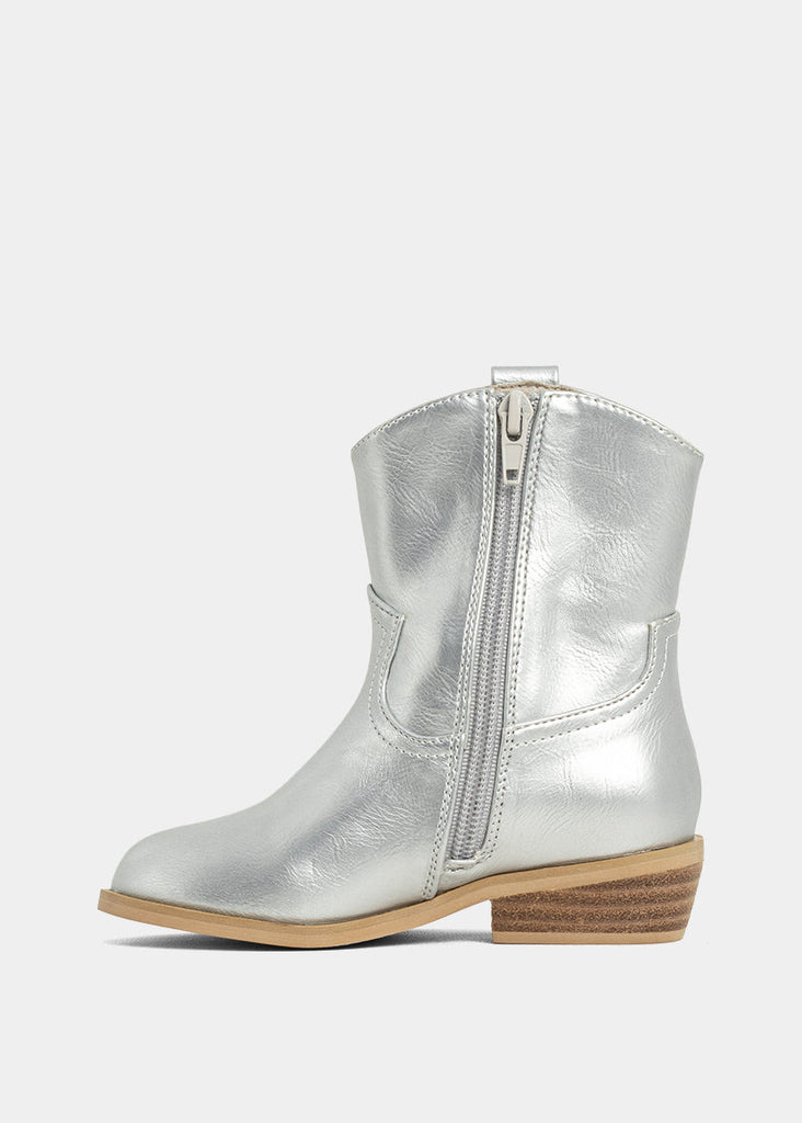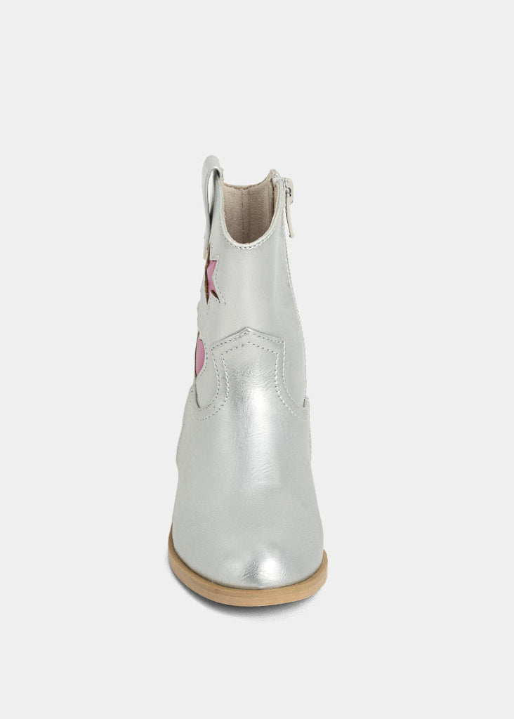 TheZIMBA MINIinSilveris here to shine-literally. This kids-only western-style boot is all about fun with a bold silver faux leather upper and bright pink appliqués in the shape of hearts and stars. The chunky low heel and inner zipper add everyday comfort and easy wear, while the playful design makes it an instant favorite for dress-up days or statement looks. From school to parties, this boot brings sparkle and personality to every step.