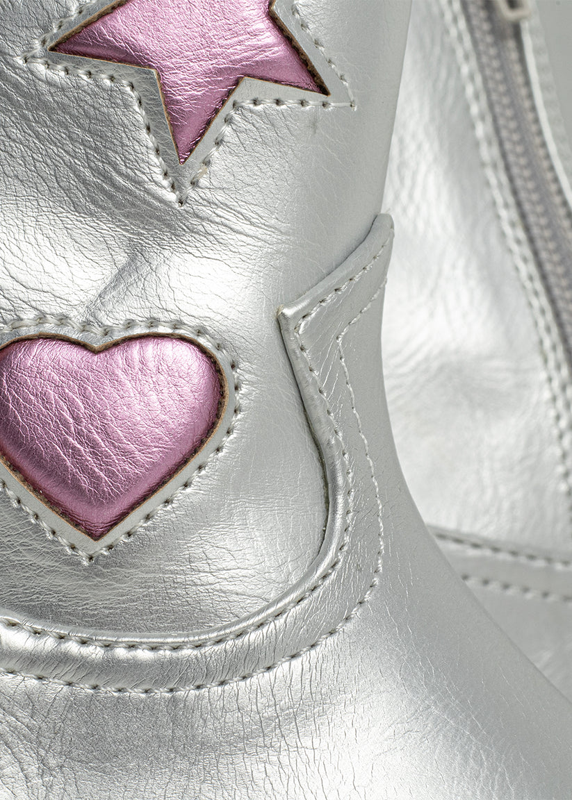 Upper: Shiny silver faux leather with pink heart and star appliqués